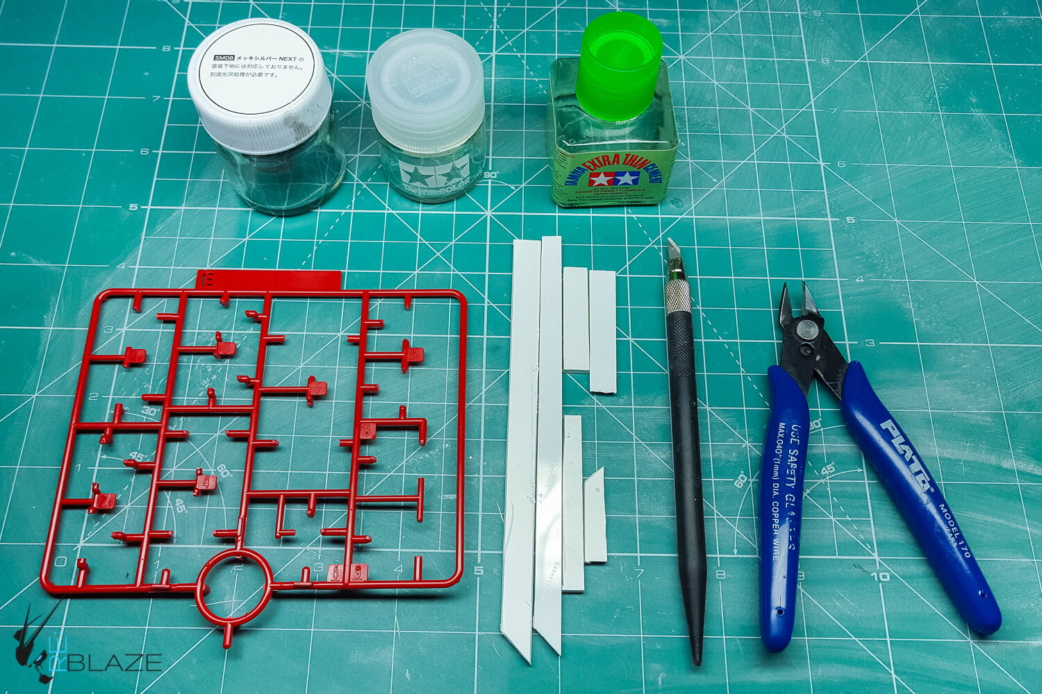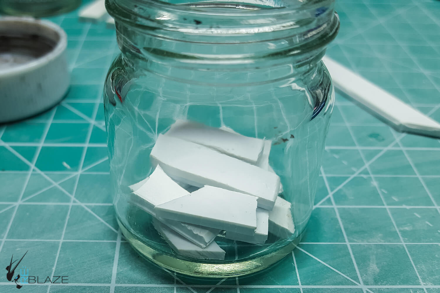 ตัดแผงพลาสติกโมเดล เป็นชิ้นเล็กๆ หรือให้พอใส่ขวดแก้วที่เราเตรียมไว้ได้ (ตามภาพเลยครับ)